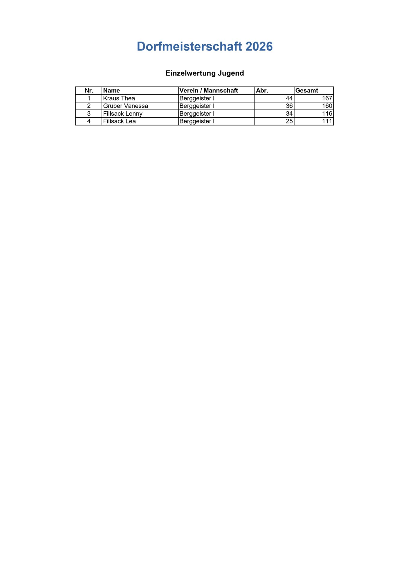 Spielergebnisse Dorfmeisterschaft Jugend